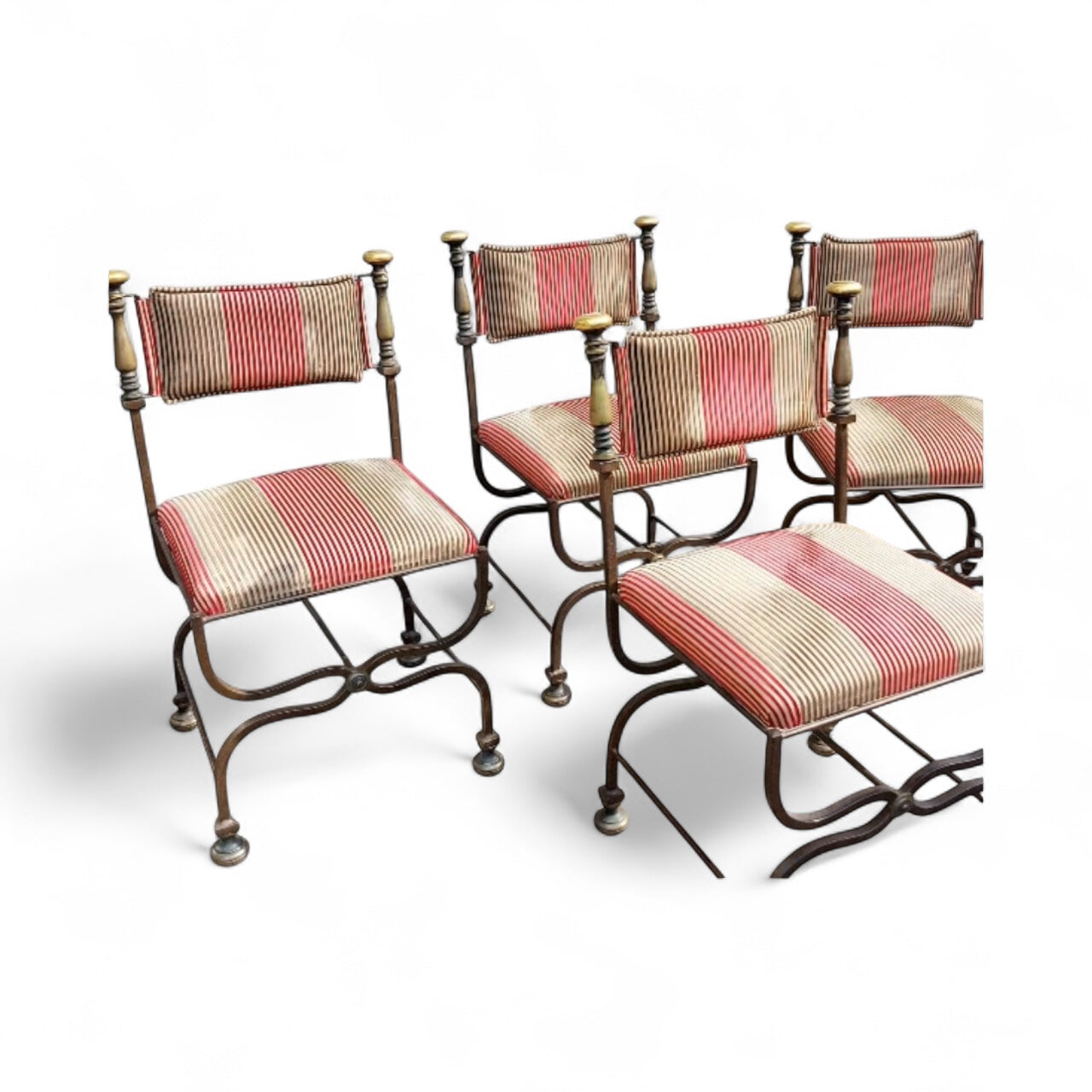 Set of four iron and brass Savonarola chairs. Cut velvet upholstery.