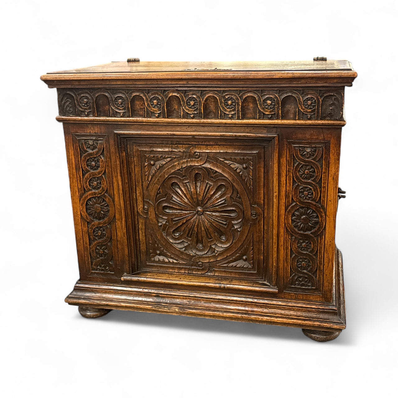 Small French 19th c coffer. Original iron hardware. Beautifully carved front